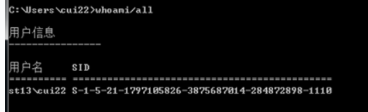 获取域内用户的详细信息(包括用户名、描述信息、SID、域名、状态等) wmic useraccount get /all