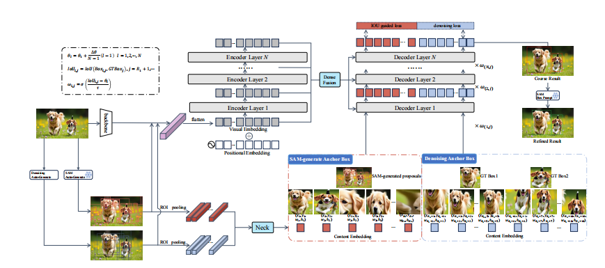 该模型主要由三个创新模块构成:高质量合成数据生成、高质量区域建议引导的查询编码和级联去噪算法。