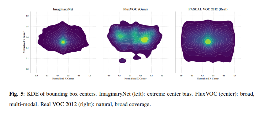 分析表2 和表3 可以发现,FluxVOC在实例数量上是ImaginaryNet的4倍,并且其类别分布更接近真实的VOC 2012数据集。更重要的是,使用相同的检测器在FluxVOC上训练,其性能(44.85% mAP@0.5)远超在ImaginaryNet上训练的结果(35.14% mAP@0.5)。从图5 的空间分布来看,ImaginaryNet的物体位置高度集中在图像中心,而FluxVOC的物体分布则更加广泛和多样,与真实数据的分布更为接近。这表明FluxVOC在数量、分布和视觉质量上都显著优于以往的合成数据集。
