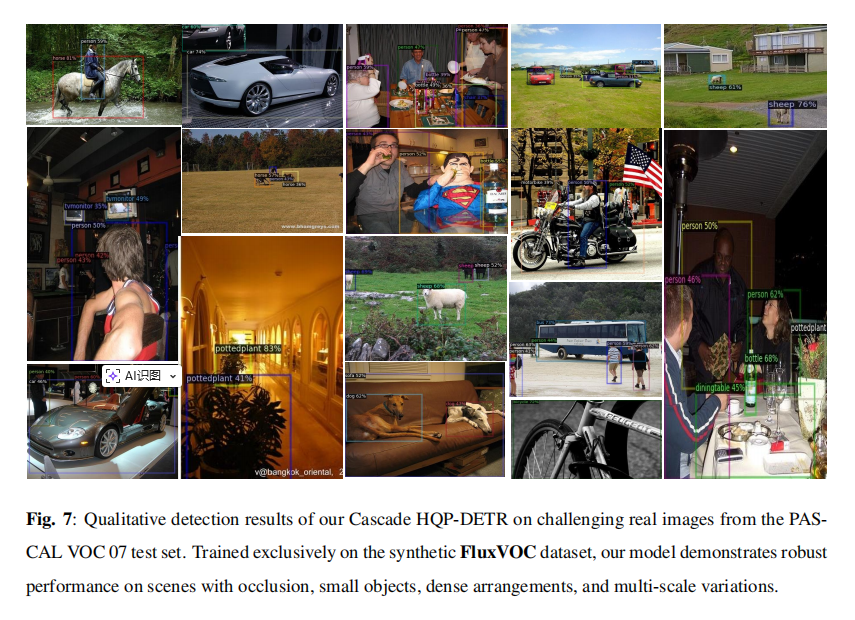 从图7 中可以看到,尽管模型完全没有见过真实的训练图像,但它依然能够在各种复杂场景下准确地检测出物体,例如存在严重遮挡的摩托车手、远距离的小物体(羊群)以及物体密集的餐桌场景。这直观地表明,模型成功地从高质量的合成数据中学到了可迁移的、鲁棒的视觉特征,实现了出色的"虚实结合"泛化能力。