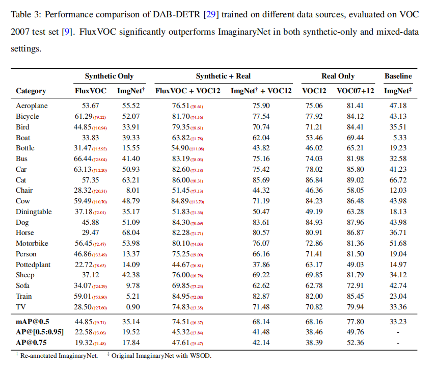 论文的实验部分设计得非常全面,旨在验证其提出的数据生成流程和模型架构的有效性。实验主要在合成的FluxVOC和FluxCOCO数据集上进行训练,并在真实的PASCAL VOC 2007和MS COCO 2014数据集上进行评测。核心评价指标为平均精度均值(mAP)。