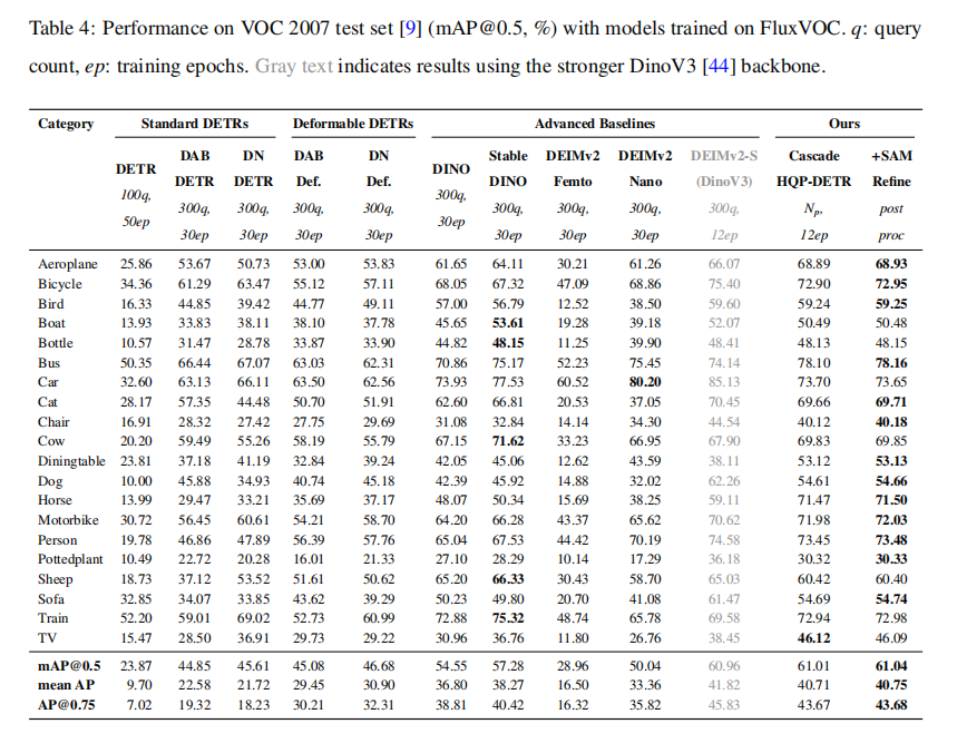 从表4 可以看出,Cascade HQP-DETR仅用12个周期的训练,就在VOC 2007测试集上实现了61.04%的mAP@0.5 ,显著超越了所有基于相同骨干网络(ResNet-50)且训练了30个周期的基准模型。例如,它比强大的基准模型StableDINO(57.28%)高出3.76个百分点。这一结果有力地证明了论文所提出的架构在虚拟监督场景下的卓越性能和训练效率。