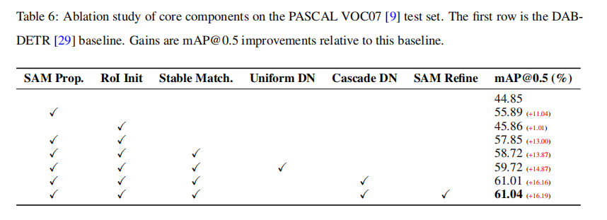 - 创新性突出:HQP引导查询编码巧妙地利用SAM解决了DETR的初始化难题,而级联去噪则为处理噪声伪标签提供了新颖且有效的思路。