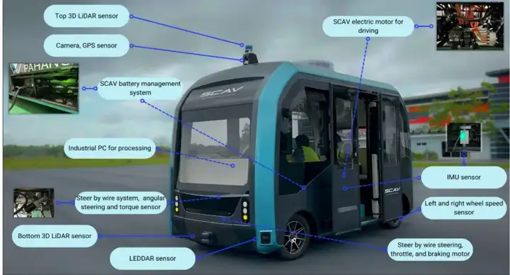 图 2、马来西亚彭亨苏丹阿卜杜拉大学(UMPSA)研发的智能校园自动驾驶汽车(SCAV),作为物理评估框架的测试案例(UMPSA,2021)