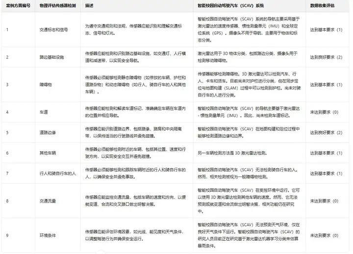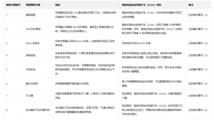 百分比得分必须至少达到 80% 才能满足第一阶段要求。(基本要求 + 良好要求)得分超过 80% 表明测试中的系统在自动驾驶安全框架第一阶段测试中处于良好状态。良好要求(VGR)值表示评估中超过基本要求标准的百分比。对于所提出的第一阶段物理评估框架,将基于以下方面对智能校园自动驾驶汽车(SCAV)进行评估:a) 评估标准 1:传感器的最低规格b) 评估标准 2:传感器的检测范围和能力c) 评估标准 3:平台传感器的测量