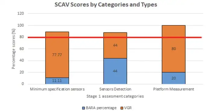 从图 11 可以看出,基本要求 + 良好要求(BARA + VGR)的综合百分比始终较高,超过了 80% 的阈值。尽管由于部分得分转向良好要求(VGR)类别导致基本要求(BARA)得分相对较低,但传感器检测类别的基本要求(BARA)得分高于其他类别。这表明智能校园自动驾驶汽车(SCAV)满足传感器检测测试最低要求的约 44%。尽管基本要求 + 良好要求(BARA + VGR)得分为 88%,与类别 1(传感器最低规格)相同,但这表明在传感器检测类别中,智能校园自动驾驶汽车(SCAV)在良好要求(VGR)领域未取得更高得分。计算结果表明,需要进一步改进以提升车辆的安全性。