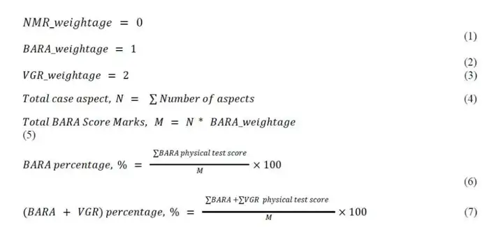 对于第一阶段物理测试,将基于三个性能矩阵对数据提交进行评估:a) 未达到要求(0)- NMRb) 达到基本要求(1)- BARAc) 达到良好要求(2)- VGR要完成第一阶段物理测试指南,被测车辆必须至少达到 80% 的基本要求达成率(BARA)。达成率的计算方法如下: