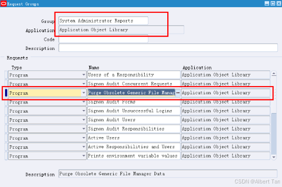 路径:SYSADMIN用户登录 --> System Administrater --> Security -->Responsibility --> Request --> 搜索并添加:Purge Obsolete Generic File Manager Data 标准程序