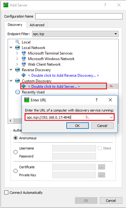 打开"Add Server"对话框,在"Custom Discovey"下点击"Double click to Add Server",在弹出的"Enter URL"对话框内输入S7-1200的OPC UA的服务器地址,如图11所示。