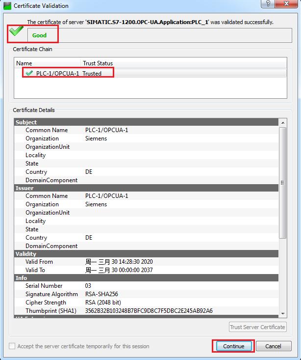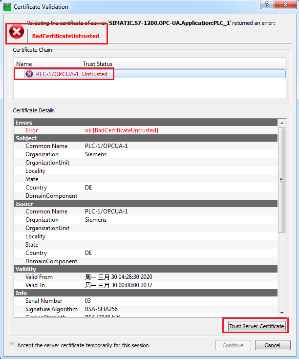首次连接需要通信双方进行证书验证,UaExpert会弹出证书验证的窗口 ,如表4所示。