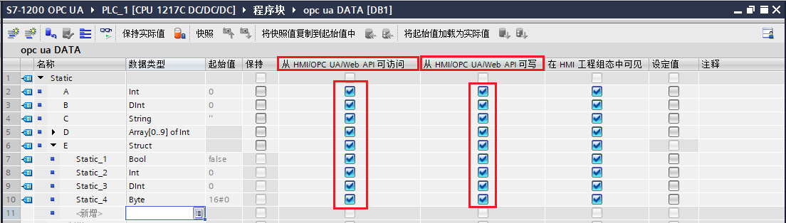 **3. 建立通信变量,**双击打开新建的DB块,并建立通信的变量,并根据需求勾选不同变量的OPC UA 读写访问属性,如图8所示。