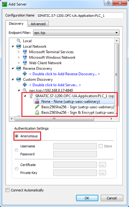 添加成功后可以浏览到S7-1200的 OPC UA Server,选择对应的安全策略,本文以None-None(uatcp-uasc-uabinary)---无安全设置以及"Anonymous"匿名访问---访客权限 登陆,然后点击"OK",如图12所示。