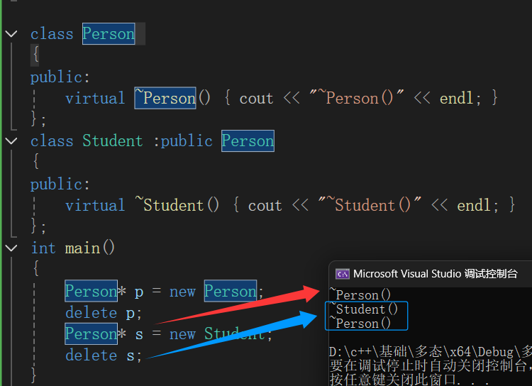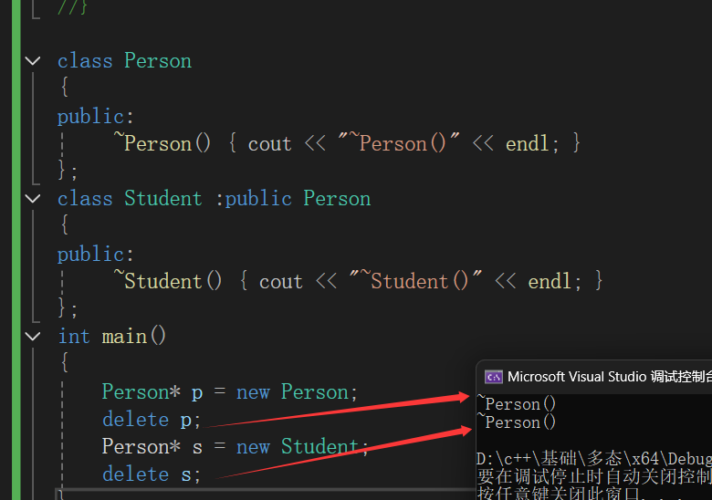 s实际为Student类型的变量,只是切割后赋值给Person指针,所以再使用delete时候,应该先析构子类再析构父类(因为开辟空间时 先构造了父类再构造的子类),但是delete s 的时候只析构了父类Person,因为该父子类的析构没有构成虚函数重新。