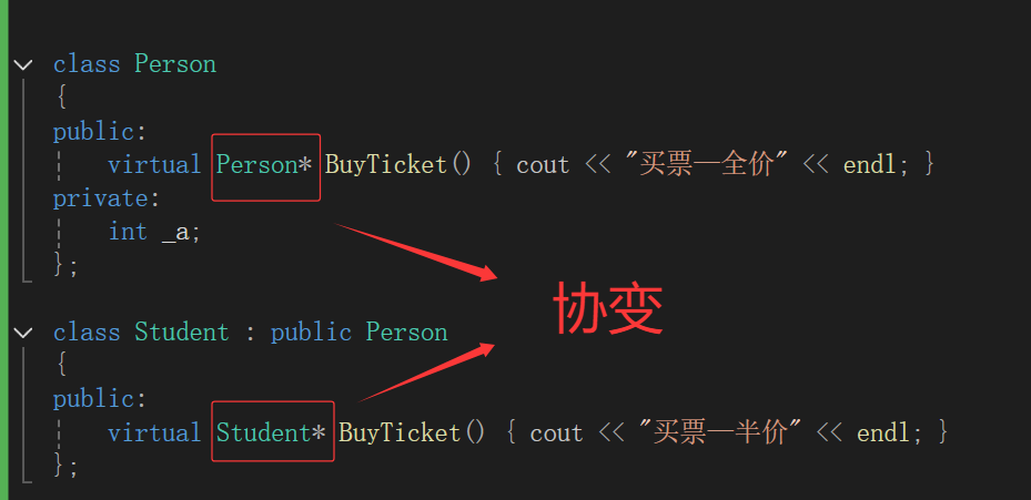 注意:只要基类虚函数的返回值与派生类的虚函数的返回值满足父子关系即可(即父类返回父类的子类返回子类的)