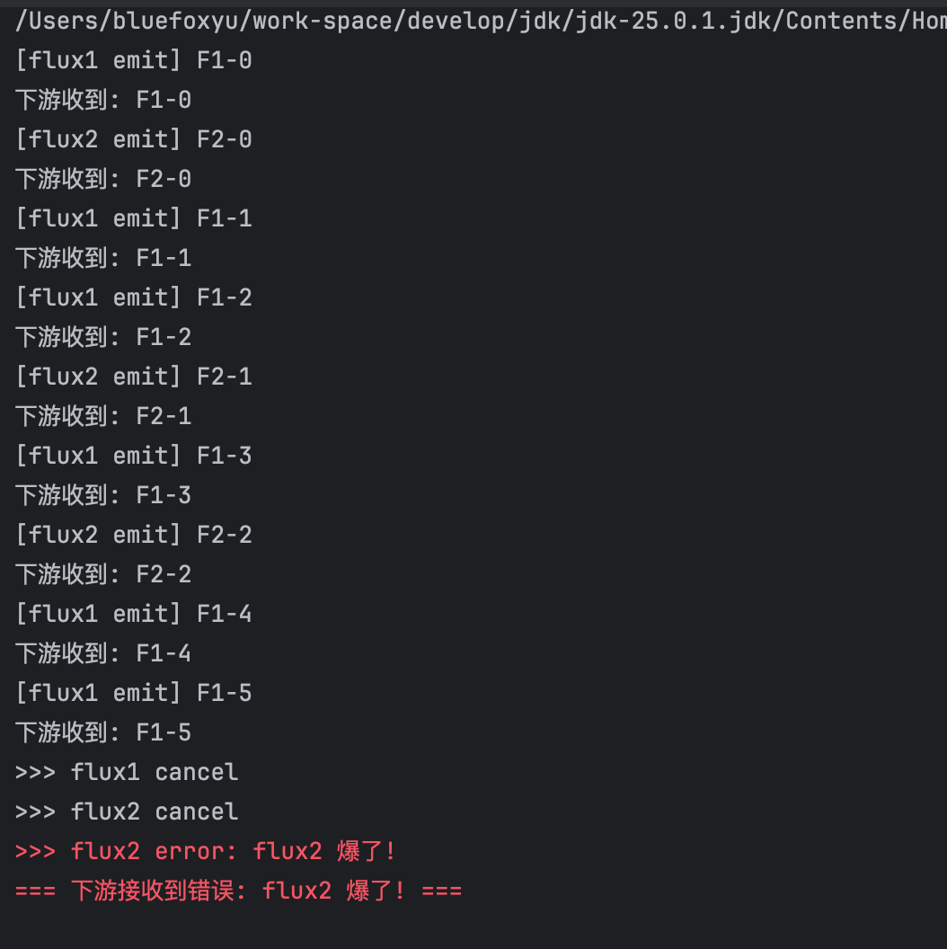 flux2抛出异常时,错误信号会终止整个合并后的流。- 所有活跃的上游(