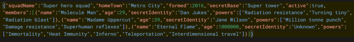 java//正常格式 { "squadName": "Super hero squad", "homeTown": "Metro City", "formed": 2016, "secretBase": "Super tower", "active": true, "members": [ { "name": "Molecule Man", "age": 29, "secretIdentity": "Dan Jukes", "powers": [ "Radiation resistance", "Turning tiny", "Radiation blast" ] }, { "name": "Madame Uppercut", "age": 39, "secretIdentity": "Jane Wilson", "powers": [ "Million tonne punch", "Damage resistance", "Superhuman reflexes" ] }, { "name": "Eternal Flame", "age": 1000000, "secretIdentity": "Unknown", "powers": [ "Immortality", "Heat Immunity", "Inferno", "Teleportation", "Interdimensional travel" ] } ] }