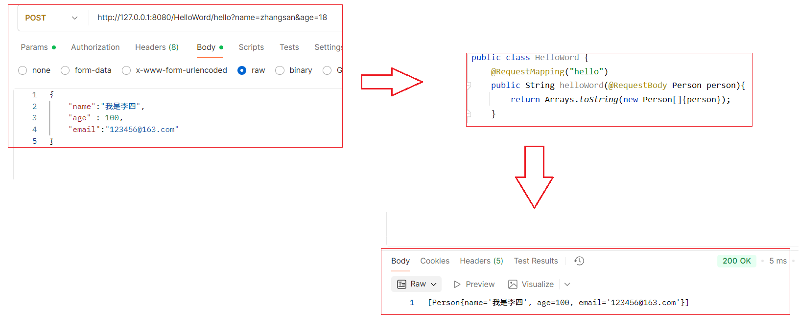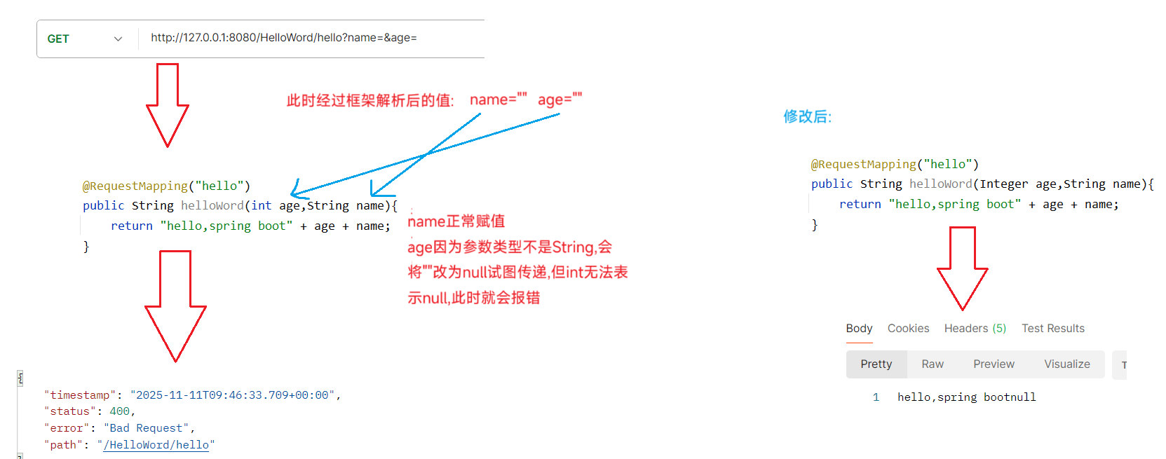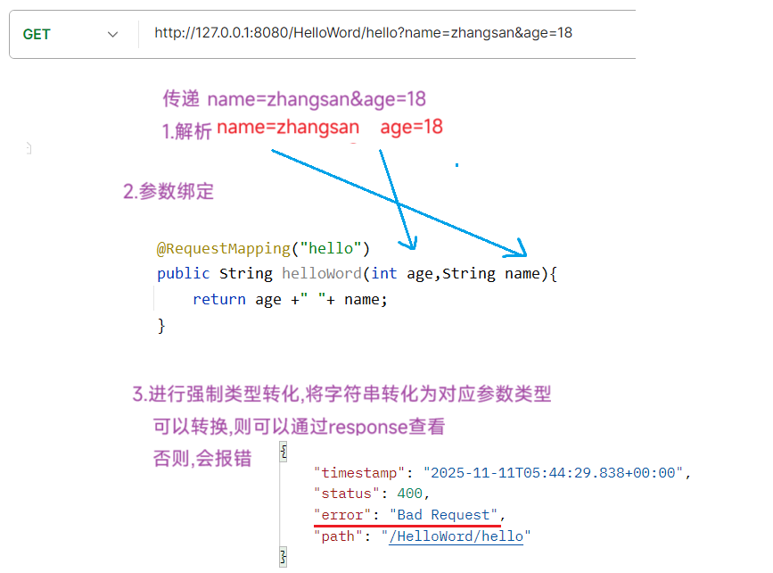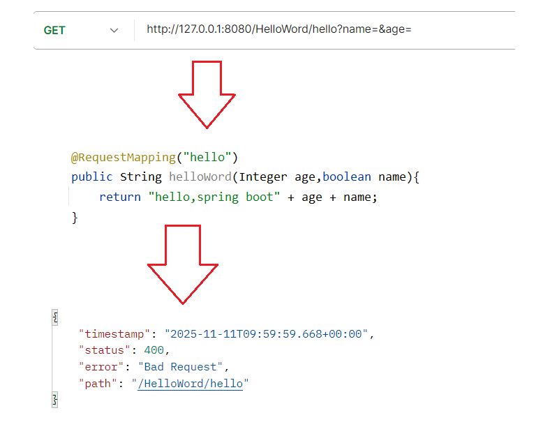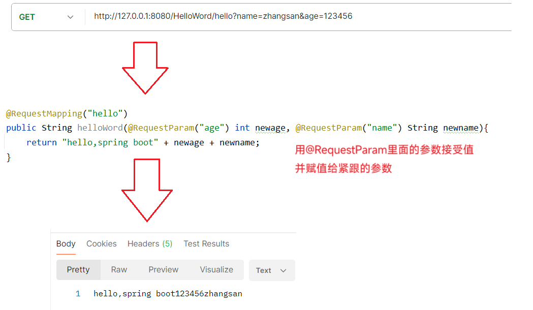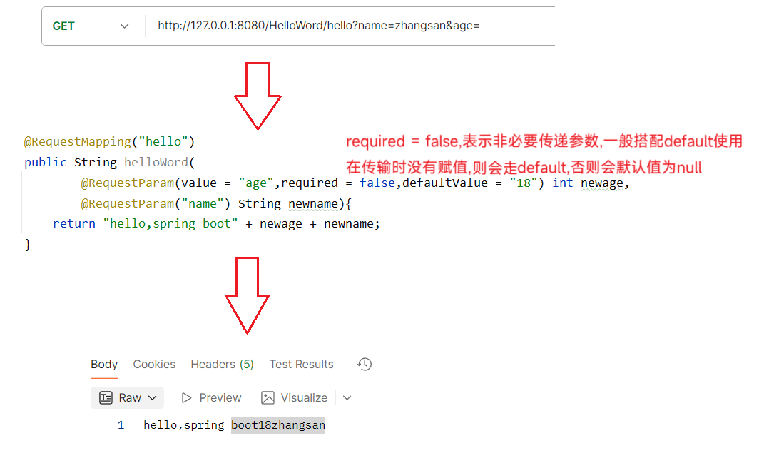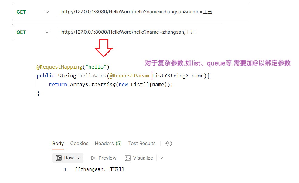 - 使⽤ @RequestParam 进⾏参数重命名时, 请求参数只能和 @RequestParam 声明的名称⼀致, 才能进⾏参数绑定和赋值.