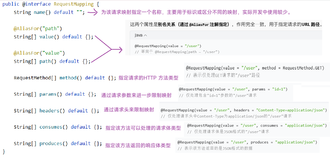 Http请求与响应报头也会向客⼾端传递⼀些附加信息, ⽐如服务程序的名称,请求的资源已移动到新地址等,这些信息通过 @RequestMapping 注解的属性来实现
