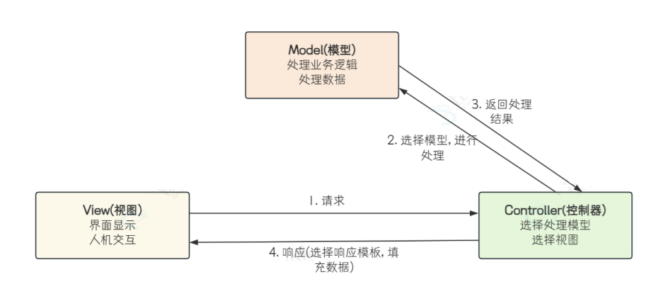 • Controller(控制器): 可以理解为⼀个分发器,⽤来连接视图和模型,用于决定对于视图发来的请求⽤哪个模型来处理,以及处理完后需要返回到哪⼀个视图