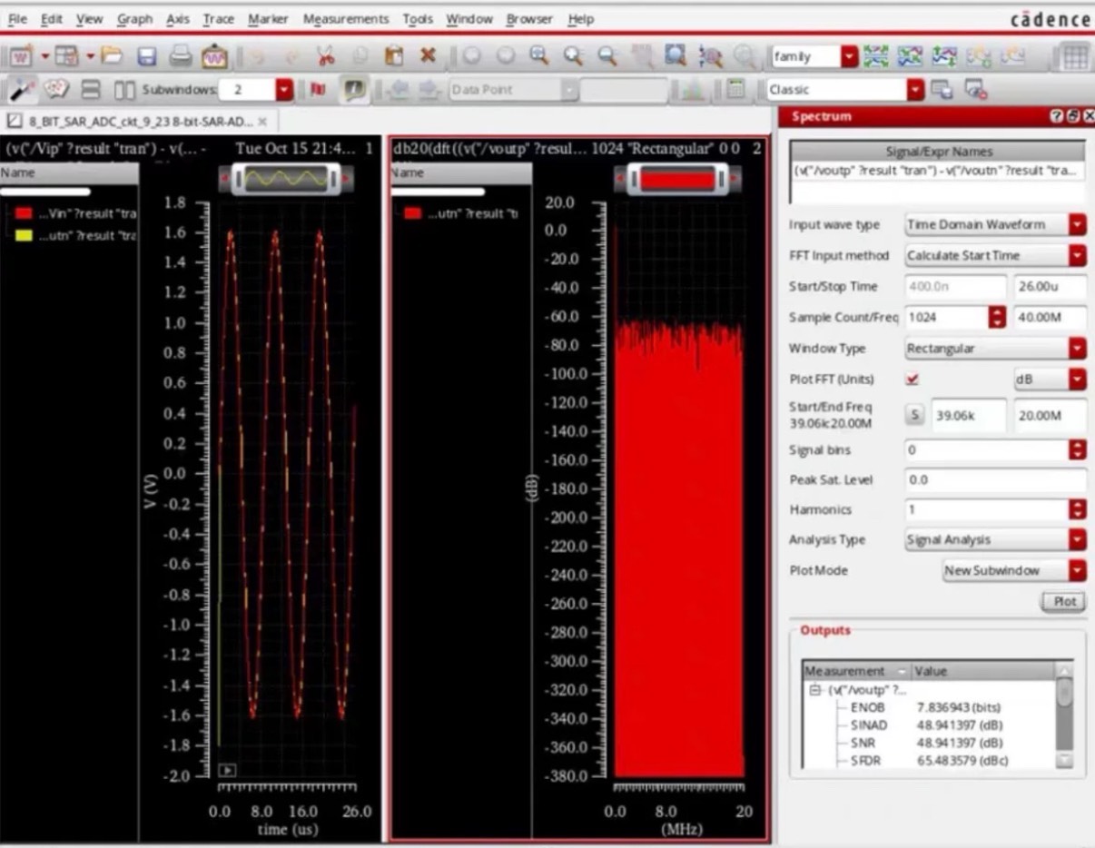实测数据挺有意思:当输入信号频率到18MHz时ENOB开始跳水,这时候把采样率降到32M又能回血到7.2bit。这说明工艺的寄生电容比想象中猛,下次改版得在CDAC的顶板走线上加shielding。整套资料已经打包成docker镜像,新人用cadence -i sar_adc.img直接开搞,连PDK都封装好了,绝对不坑队友。