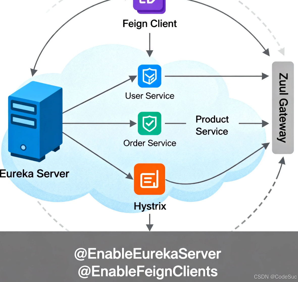 Spring Cloud 以"Release Train"方式管理版本,与 Spring Boot 存在严格兼容关系。现代常见组合为 Spring Boot 3.x 搭配 Spring Cloud 2022.x/2023.x。Netflix 系列的演进路径需要注意: