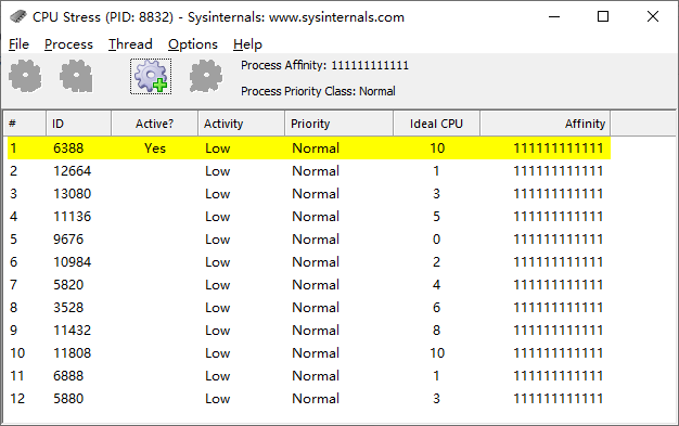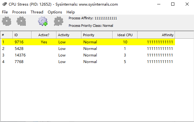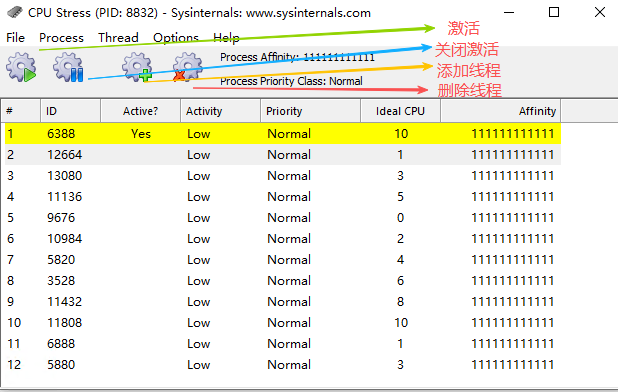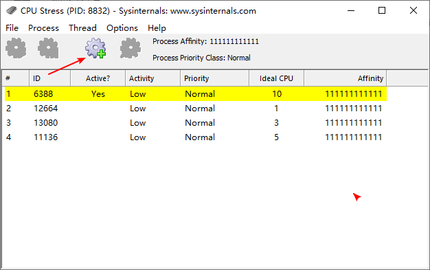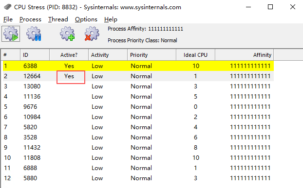 - 默认打开后界面里有 4 条线程,其中只有 1 条被激活 (Active?=Yes),可通过如下添加线程