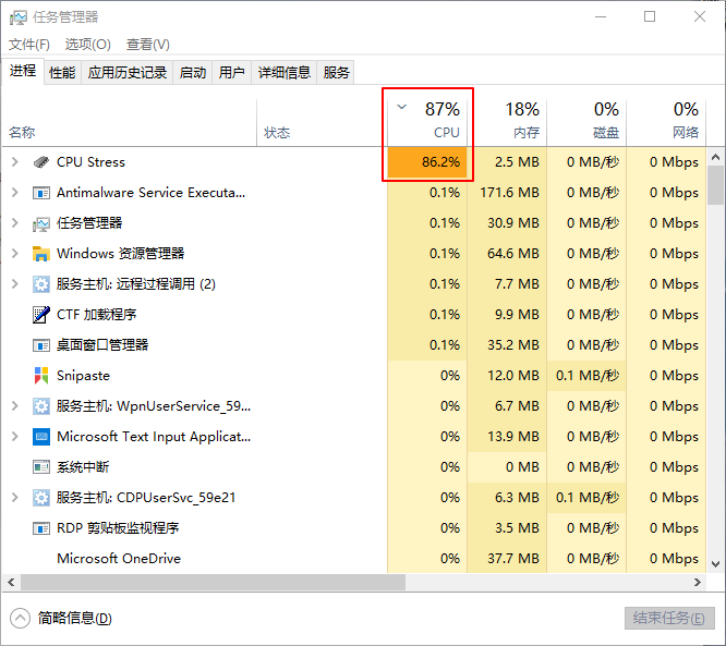 - 查看任务管理器,进程,cpu排序,就可以看到此程序占用多少%。