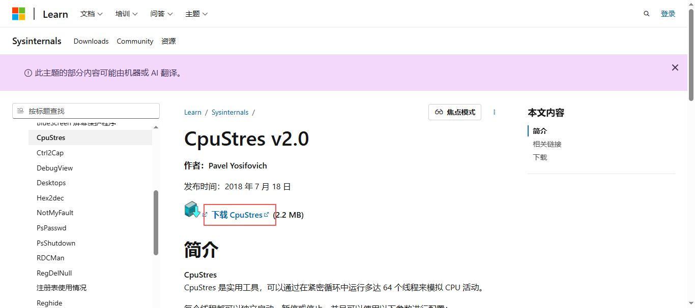 cpustres官方下载连接:https://learn.microsoft.com/zh-cn/sysinternals/downloads/cpustres