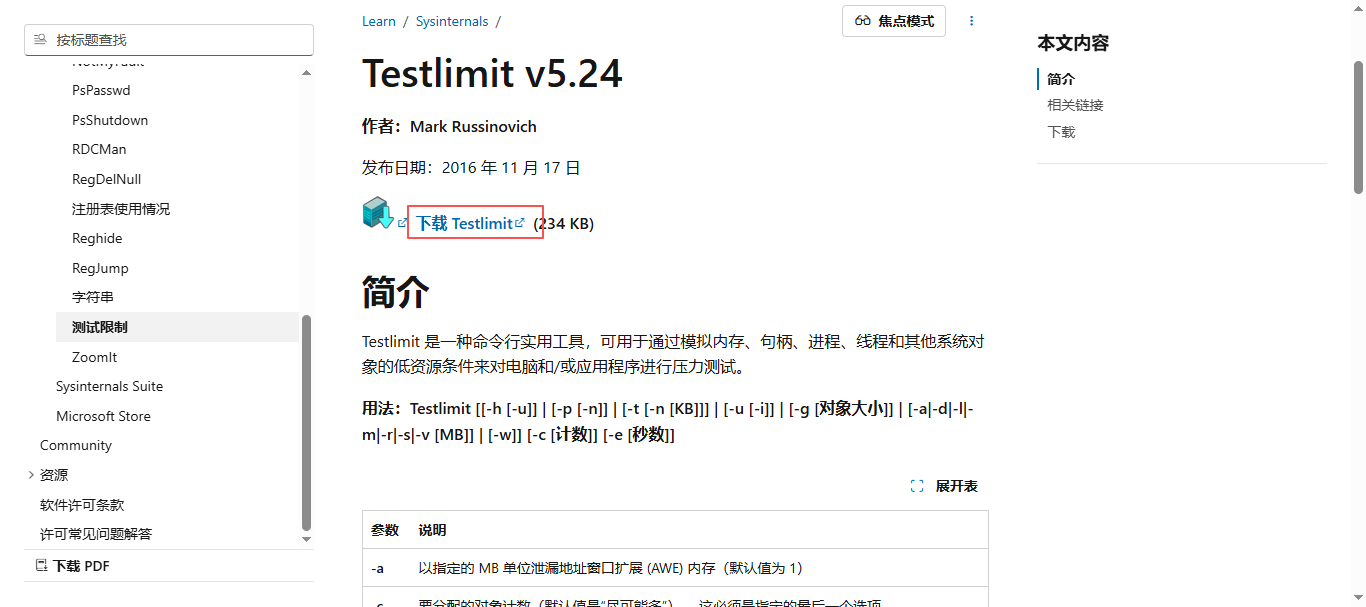 testlimit官方下载连接:https://learn.microsoft.com/zh-cn/sysinternals/downloads/testlimit