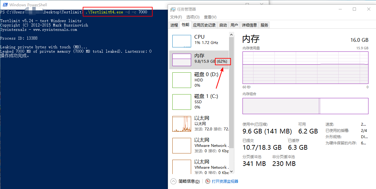 Testlimit64.exe命令压测内存:Testlimit64.exe -d -c xxx。 xxx 是以MB为单位。