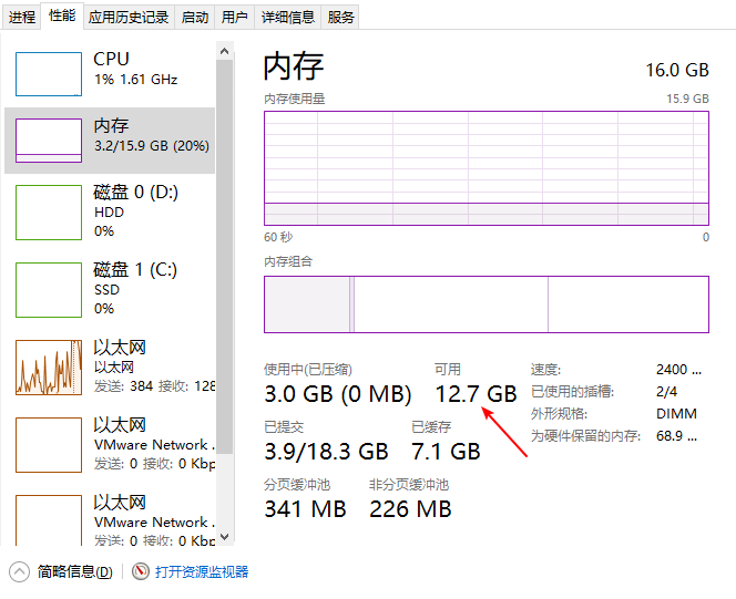 - 查看资源管理器,当前还有多少内存,总共多少内存,需要达到多少%,计算大概需要占用的内存