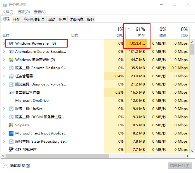 - 也可也查看任务管理器,进程,内存排序,就可以看到此程序占用多少%。