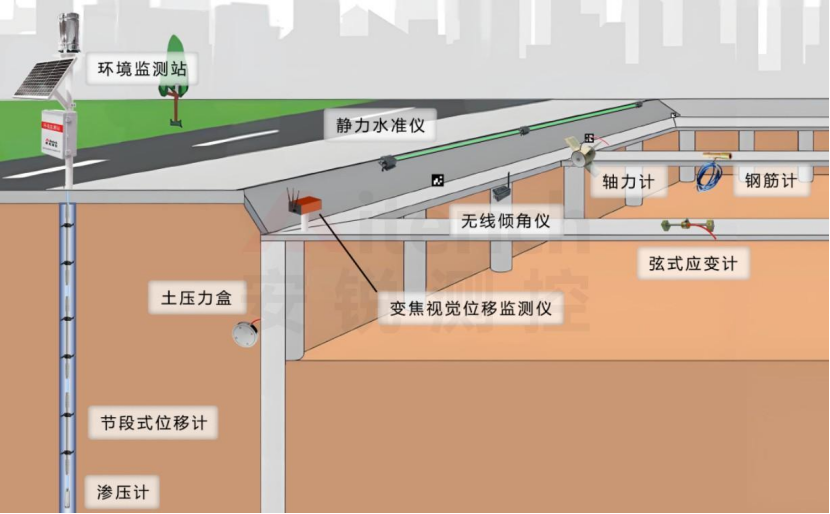 ① 基坑实时监测 实时采集围护墙变形、地表沉降、支护应力、地下水位等关键参数,连续追踪基坑开挖各阶段(如土方开挖、垫层施工)的安全状态,及时发现潜在风险。