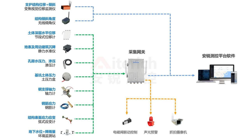 智能基坑监测评估系统是由前端高精度传感器、中端数据采集传输设备与后端安锐云平台组成的自动化安全监测体系。该系统通过在基坑围护结构(排桩、地下连续墙)、周边土体、邻近建筑及管线等关键区域布设传感器,实时采集土体深层位移、支护桩倾斜、地表沉降、支护结构应力、地下水位及周边管线变形等核心参数,实现对基坑稳定性与周边环境影响的动态感知。