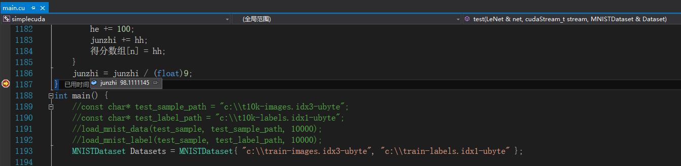 void test( LeNet &net, cudaStream_t stream, MNISTDataset &Dataset) {//使用10000