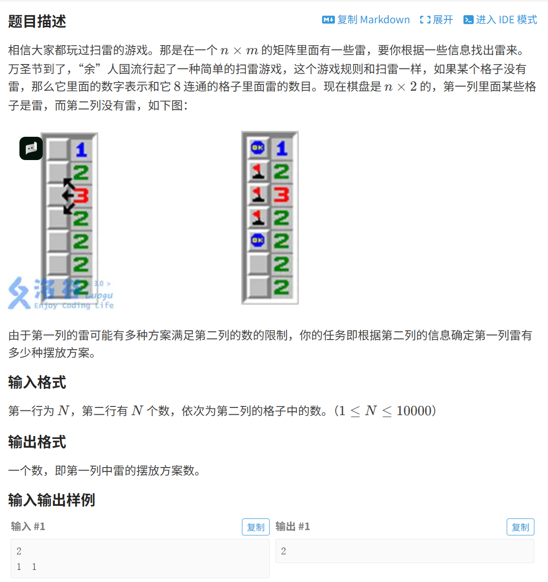 - 比如第二列第 n 个值,对应的是第一列 n-1、n、n+1 三个格子的雷数。但第一列实际只有 n 个格子,所以你想通过" a[n+1] 必须是0(无雷)"来约束最后一个位置的合法性。