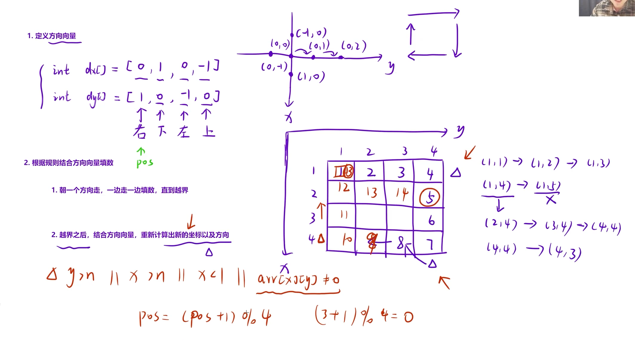 初始值为0(从"右"方向开始),遇到边界时通过 pos=(pos+1)%4 切换方向。