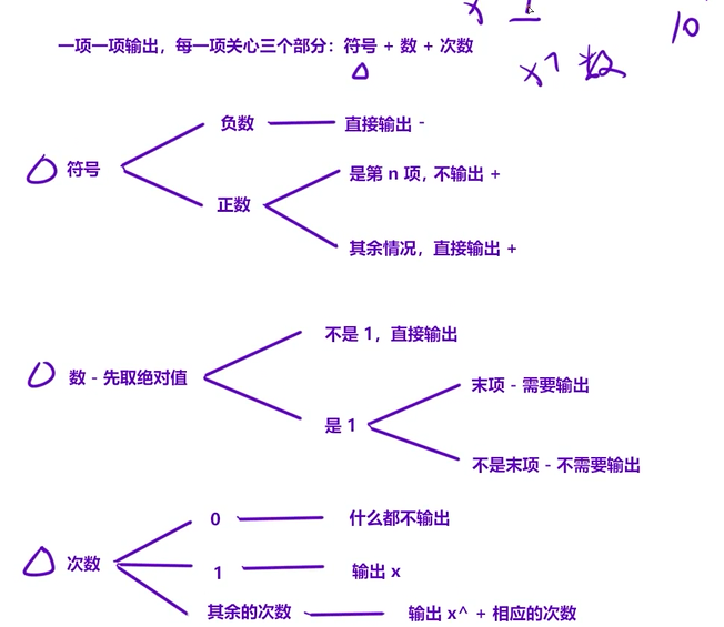 比如 1x^3 要写成 x^3 ,代码中通过"系数=1且不是常数项时不输出"实现了这一点;但常数项 1 必须输出(比如样例2的末尾 +1 )。