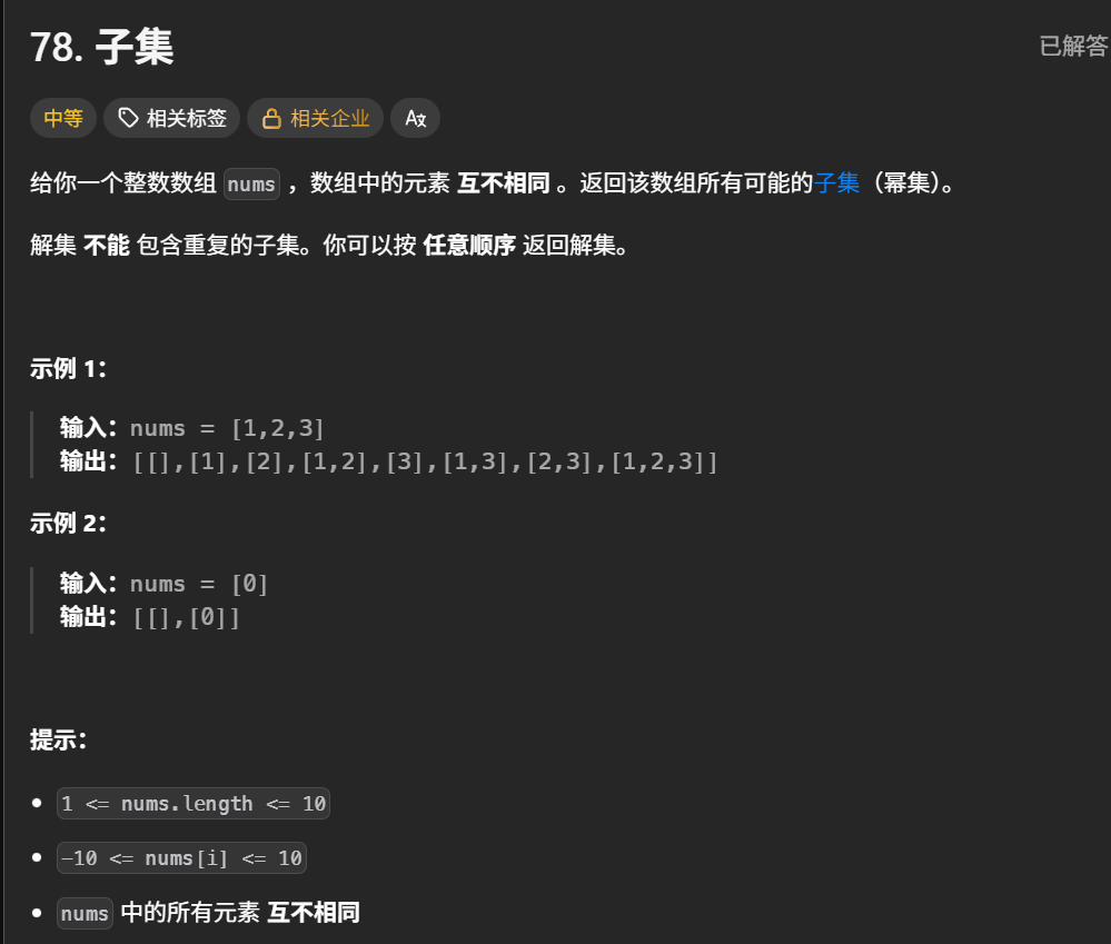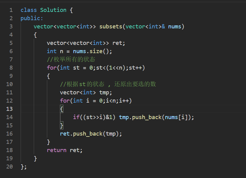 - 1 << n 等价于 2^n(左移n位),所以循环会从 0 遍历到 2^n - 1,覆盖所有 n位二进制数 的可能(正好对应所有子集的选择状态)。
