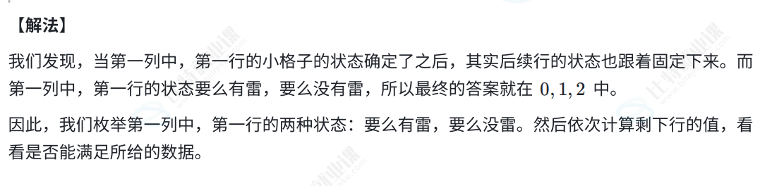- check1() / check2() :分别枚举第一列第1个格子是0(非雷)/1(雷)的情况。