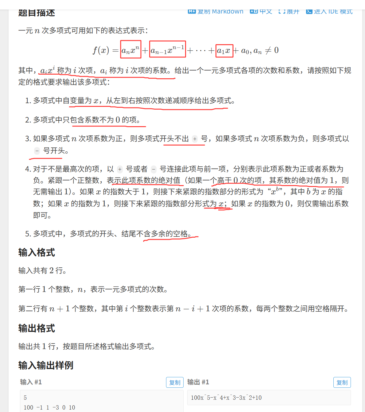 最高次项系数为正时,开头不能有 + (比如样例1的 100x^5 开头没有 + ),代码中通过 if (i!=n) 控制了这一点。