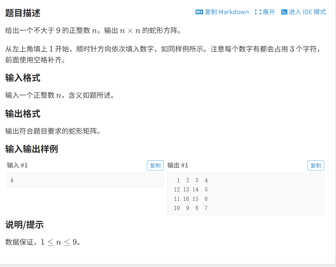 n :是输入的正整数,表示要生成的蛇形矩阵的边长( n×n 矩阵)。