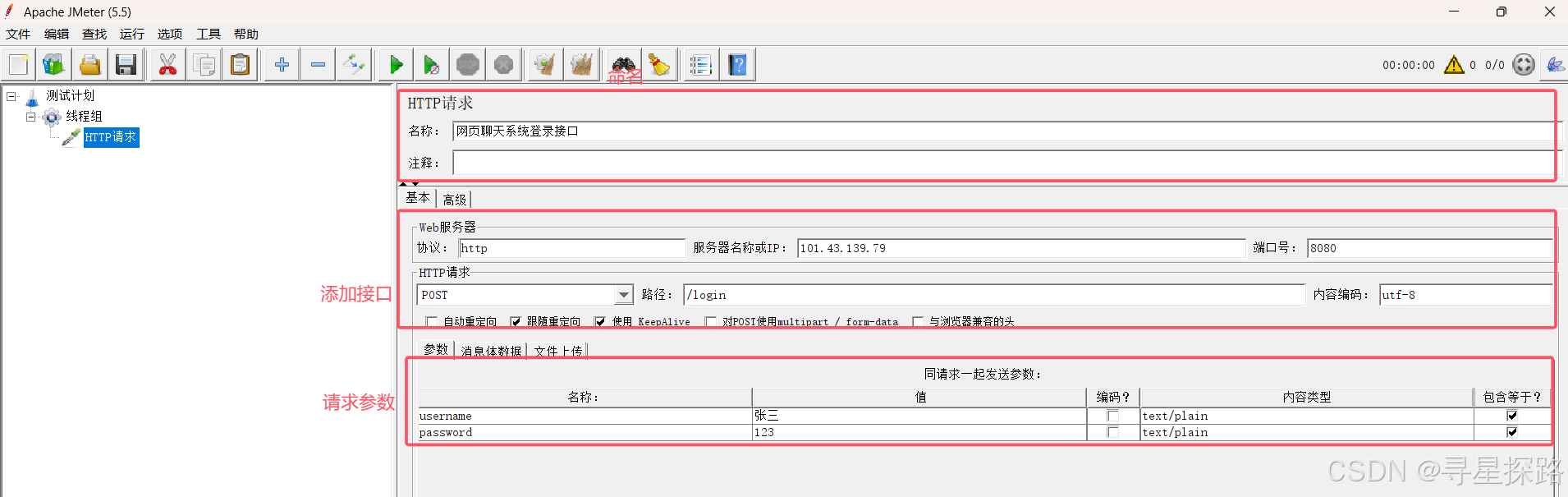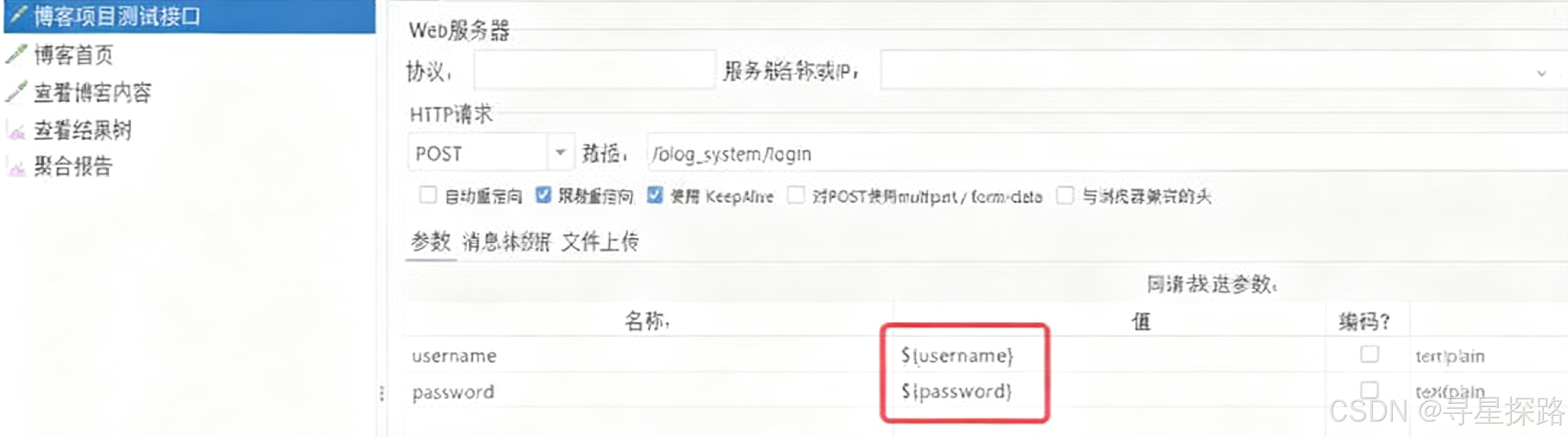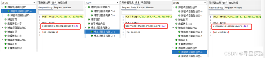 以登陆接口为例,当我们执行登陆接口的性能测试时,手动配置了用户名和密码为固定的username和 password,然而实际使用中不可能只有一个用户登陆,为了模拟更真实的登录环境,我们需要提供更多的用户username和password来实现登录操作