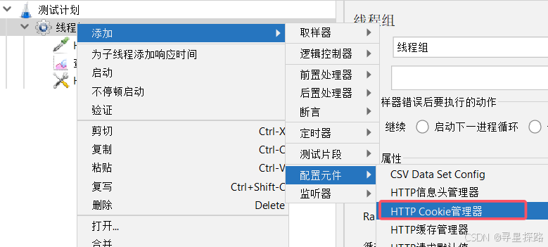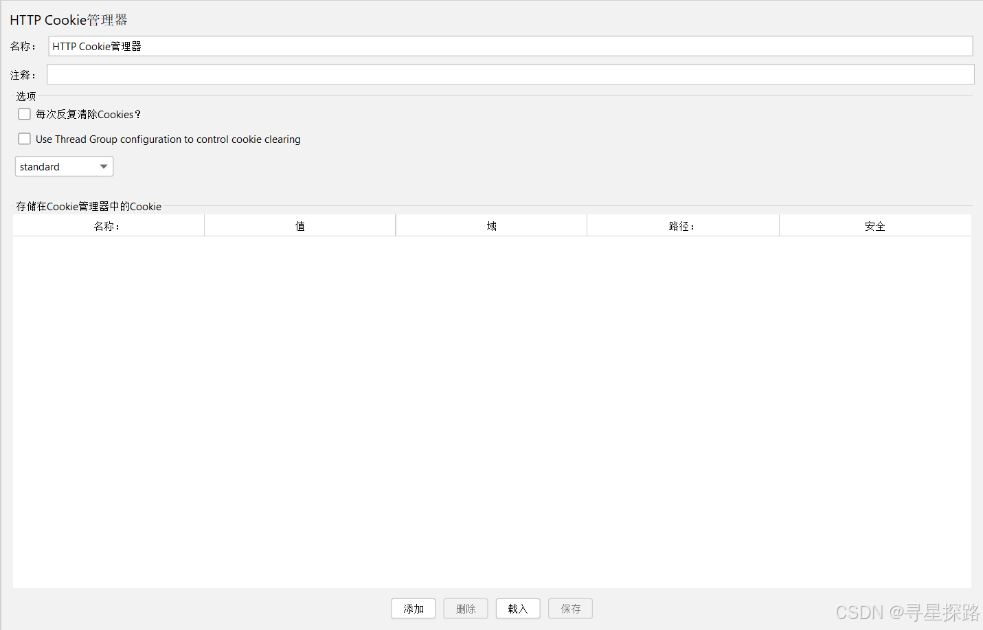 HTTP Cookie管理器像Web浏览器一样存储和发送Cookie。如果HTTP请求并且响应包含cookie,则 Cookie管理器会自动存储该cookie,并将其用于将来对该特定网站的所有请求。每个JMeter线程都有自己的"cookie存储区"。因此,正在测试使用cookie存储会话信息的网站,则每个JMeter线程都将拥有自己的会话。此类Cookie不会显示在Cookie管理器显示屏上,可以使用"查看结果树监听器"查看。
