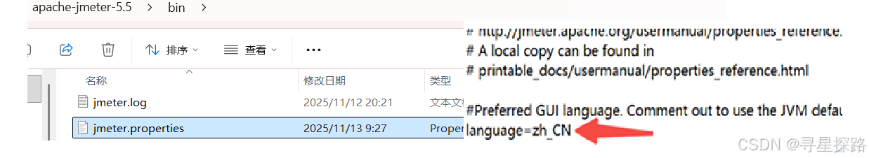 在jmeter的bin目录下,修改文件中的内容:language=zh_CN