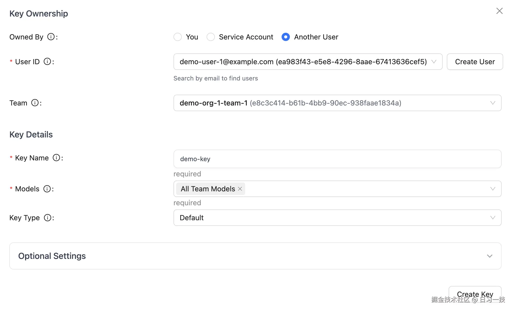 - 用户+团队密钥(User + Team Key):同时关联用户和团队,能定位个人在团队上下文中的身份,同时追踪个人+团队的使用情况,当删除用户时密钥失效;适用于团队成员在团队资源上的个人工作、个人问责制的团队项目等;