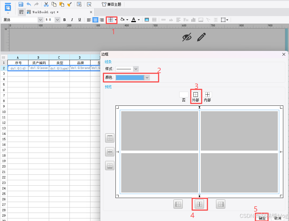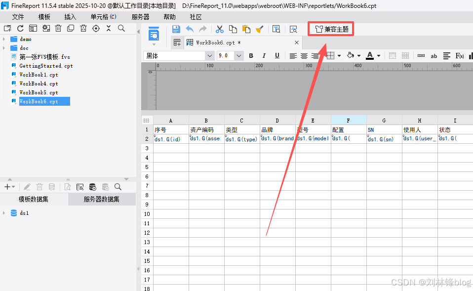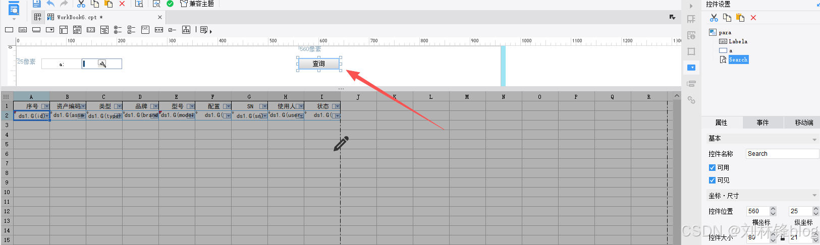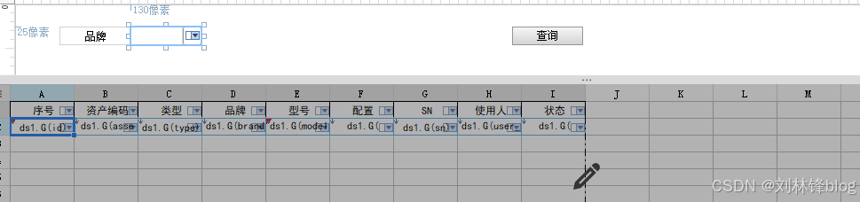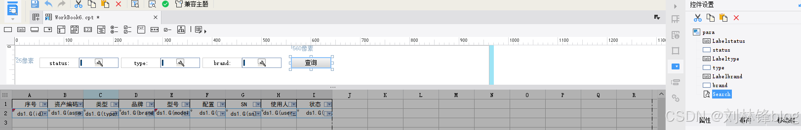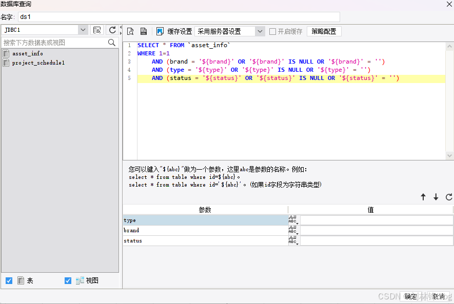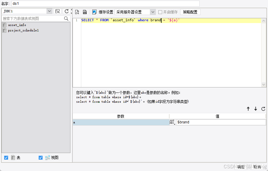 1)打开准备的模板,修改 ds1 语句为:SELECT * FROM `asset_info` where brand= '${a}'如下图所示:
