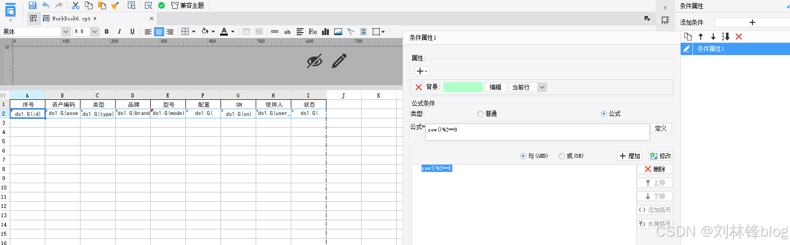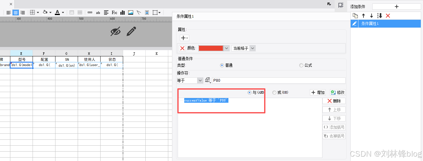 选中单元格后,点击「条件属性>添加条件」,可添加条件属性。如下图所示: