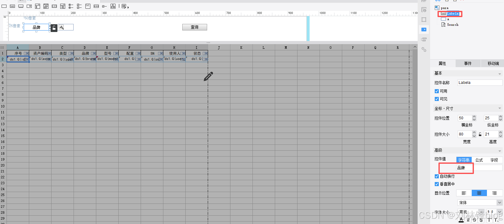 3)点击右侧的「控件设置」,选中「Labela」,选择「属性」,修改控件值为字符串「品牌」。如下图所示: