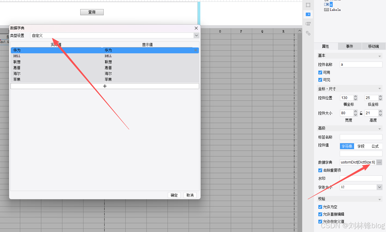 5)点击右侧的「控件设置」,选中「a」,选择「属性」,设置数据字典为「自定义」,实际值分别为具体品牌,显示值与实际值相同。如下图所示: